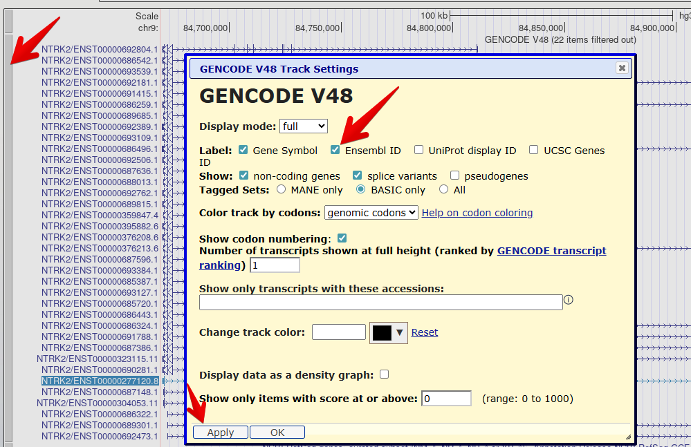 Right click on the GENCODE track grey bar and select