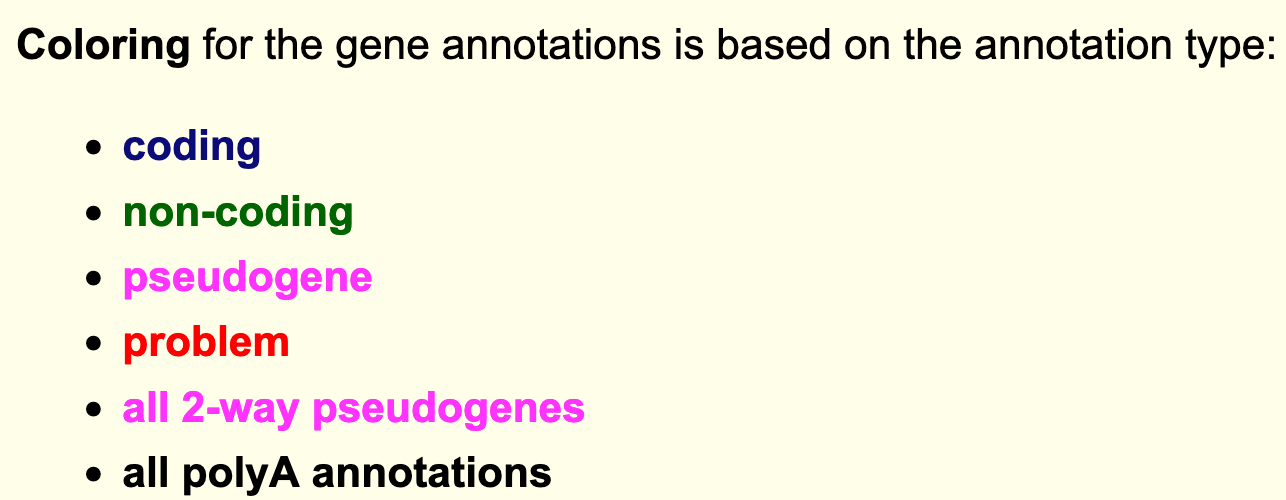 - Colouring information is specific for each track and can be obtained from the configuration page. Below is the colouring legend for the GENCODE V36 track.
