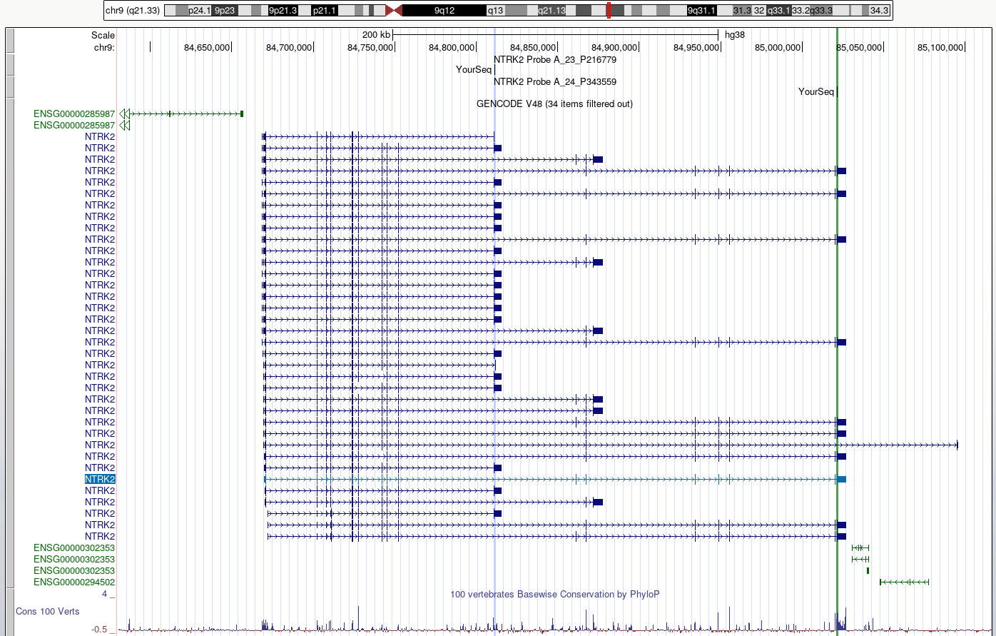 drag-and-selectto select only the region of homology for each probe within the NTRK2 gene. Use a different highlight for each region.Zoom out to view the whole gene again.