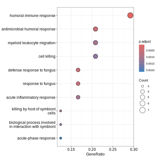 Using the significant DE proteins, we can perform functional enrichment analysis to determine whether certain biological processes (BP), cellular components (CC), or molecular functions (MF) are over-represented.