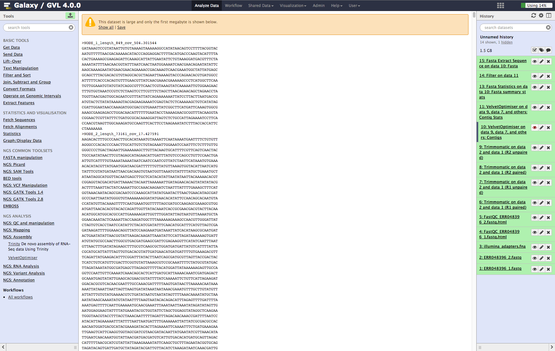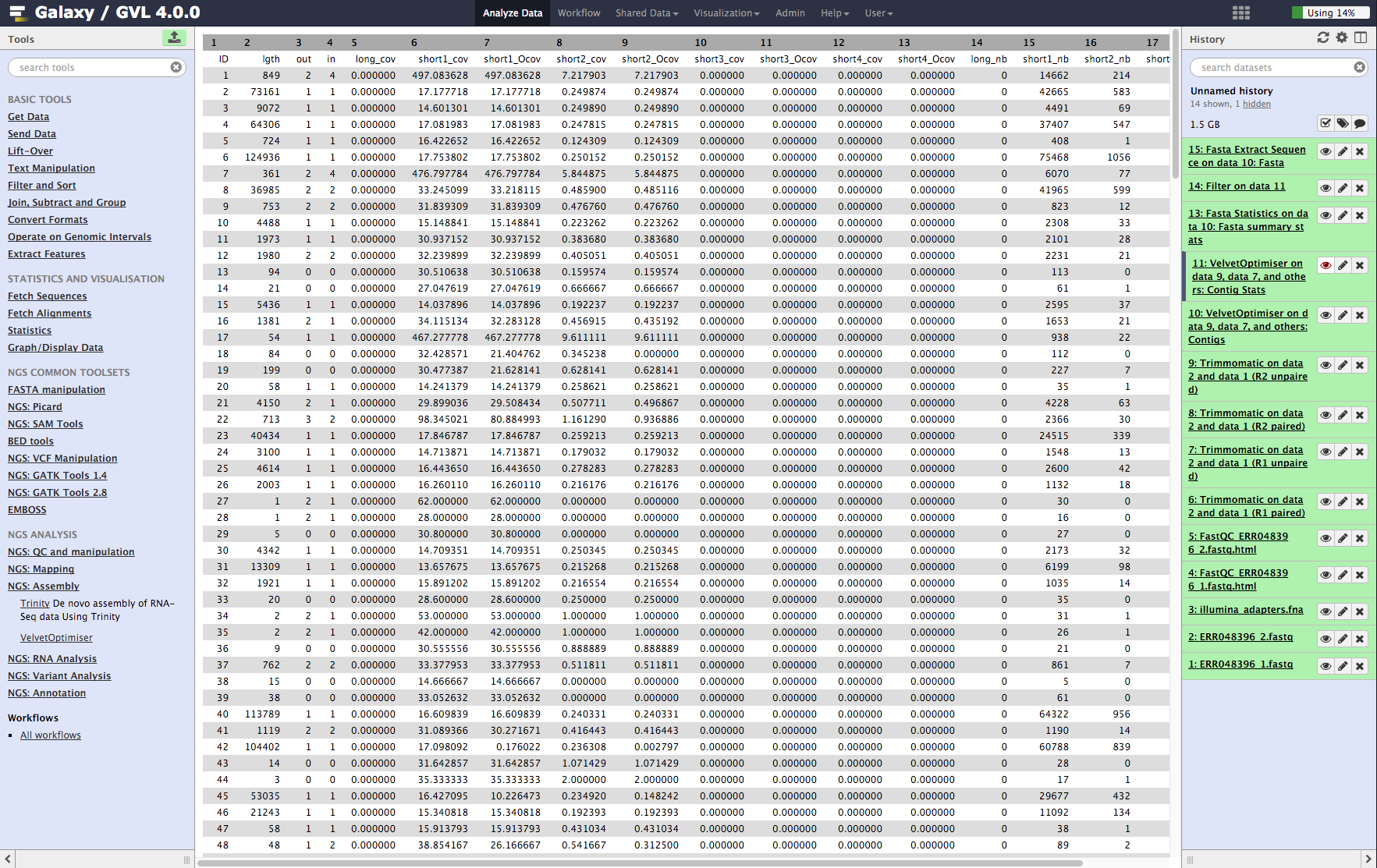 Once step 1 is complete, you should now have 2 new objects in your history: * VelvetOptimiser on data 9, data 7, and others: Contigs * VelvetOptimiser on data 9, data 7, and others: Contig Stats