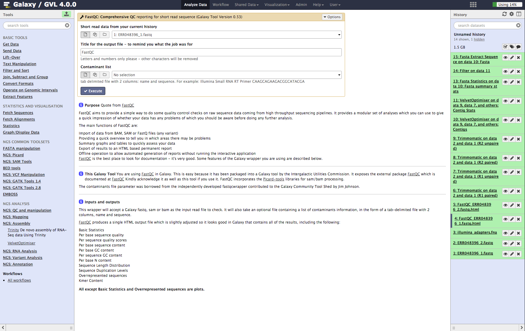 - From the tools menu in the left hand panel of Galaxy, select NGS QC and manipulation > FastQC: Comprehensive QC (down the bottom of this category) and run with these parameters: