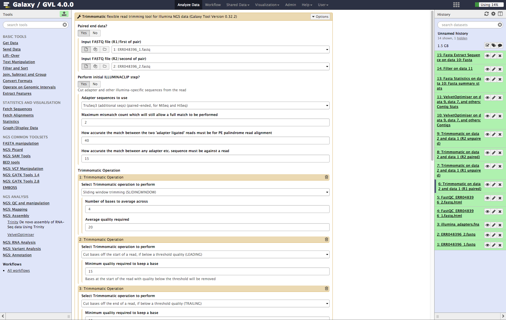From the tools menu in the left hand panel of Galaxy, select NGS QC and manipulation > Trimmomatic and run with these parameters (only the non-default selections are listed here):