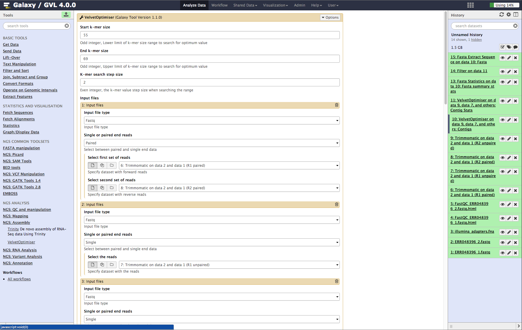 We will use a single tool, Velvet Optimiser, which takes the trimmed reads from Trimmomatic and performs numerous Velvet assemblies to find the best one. We need to add the reads in two separate libraries. One for the still paired reads and the other for the singleton reads orphaned from their pairs by the trimming process.