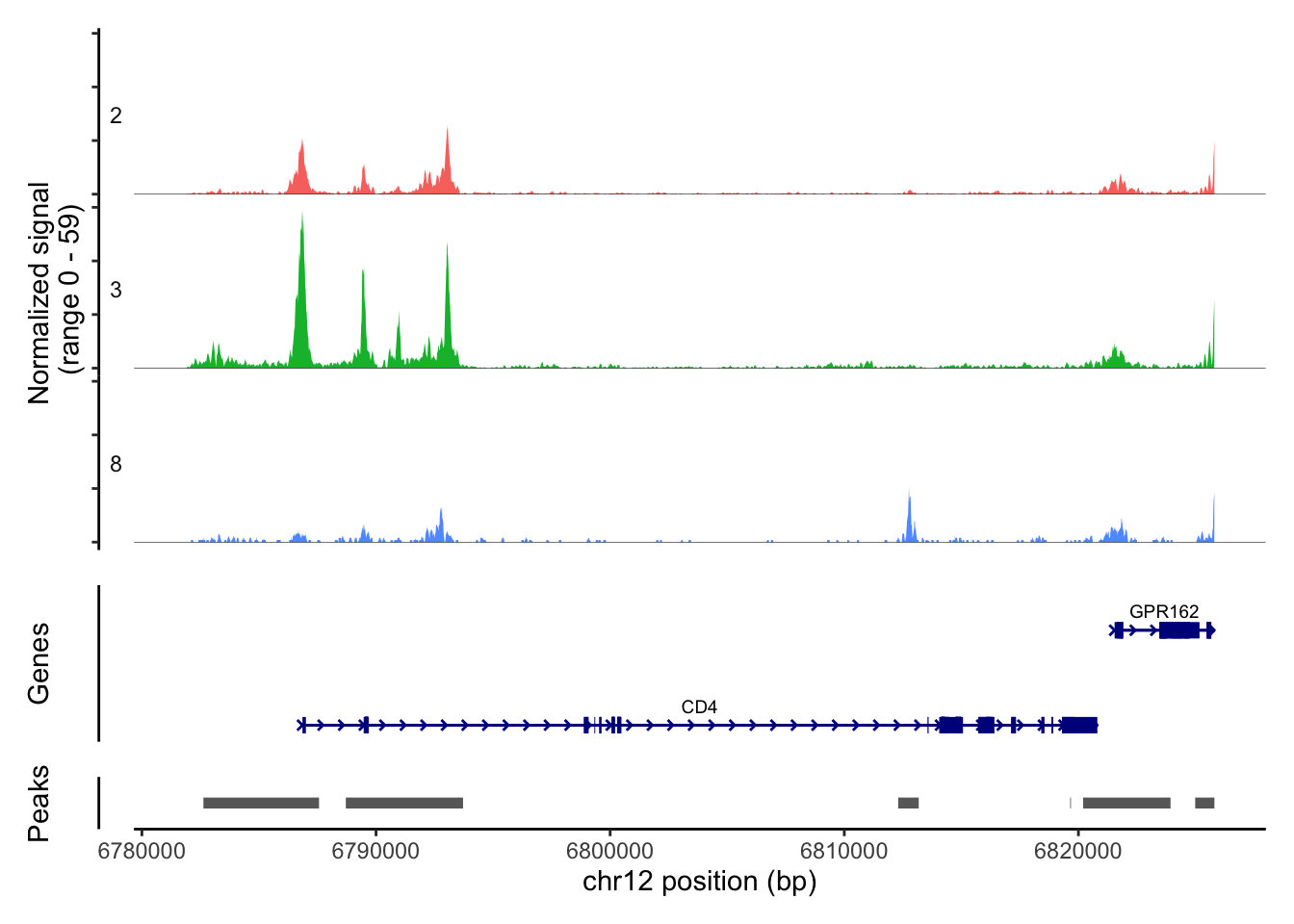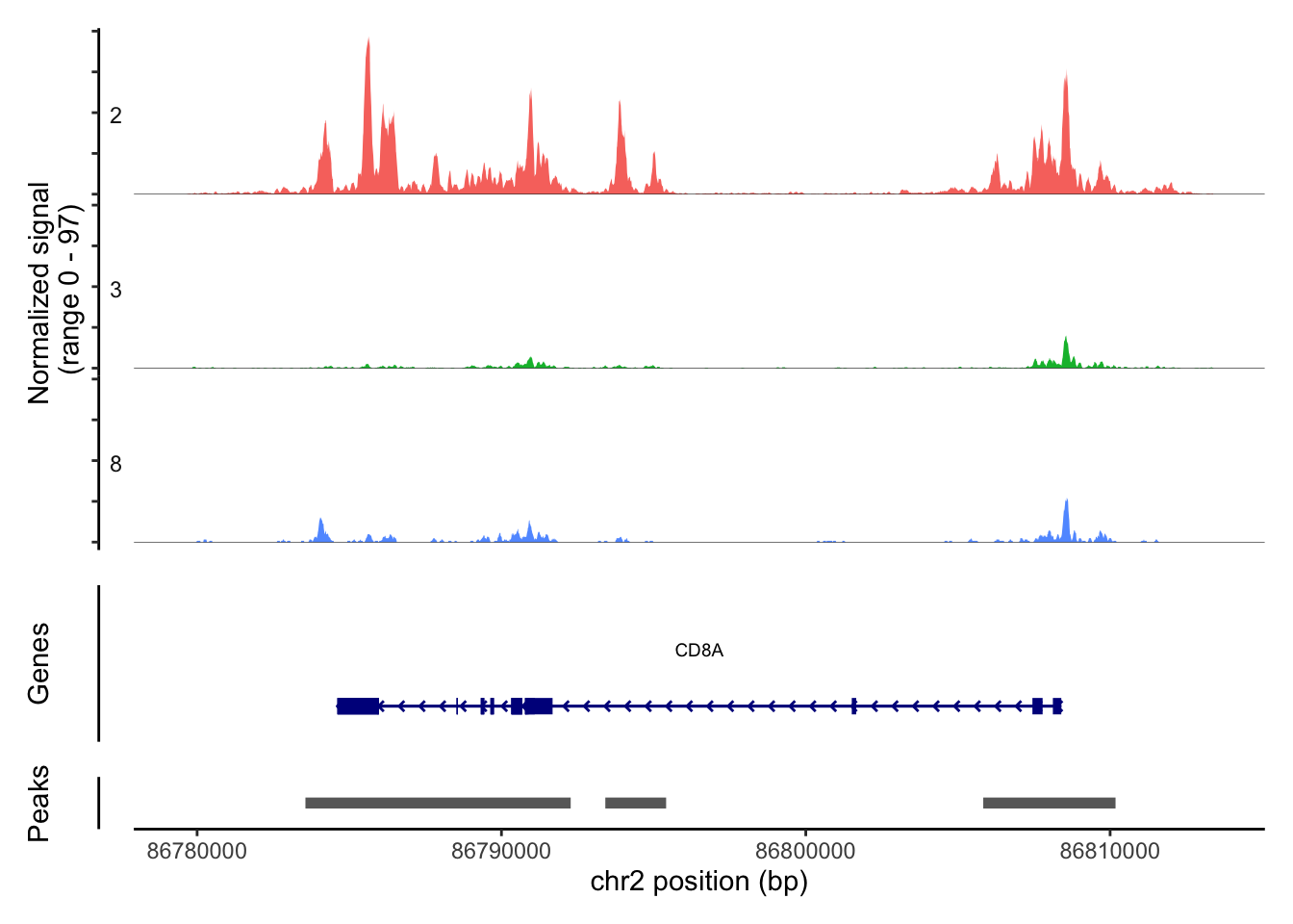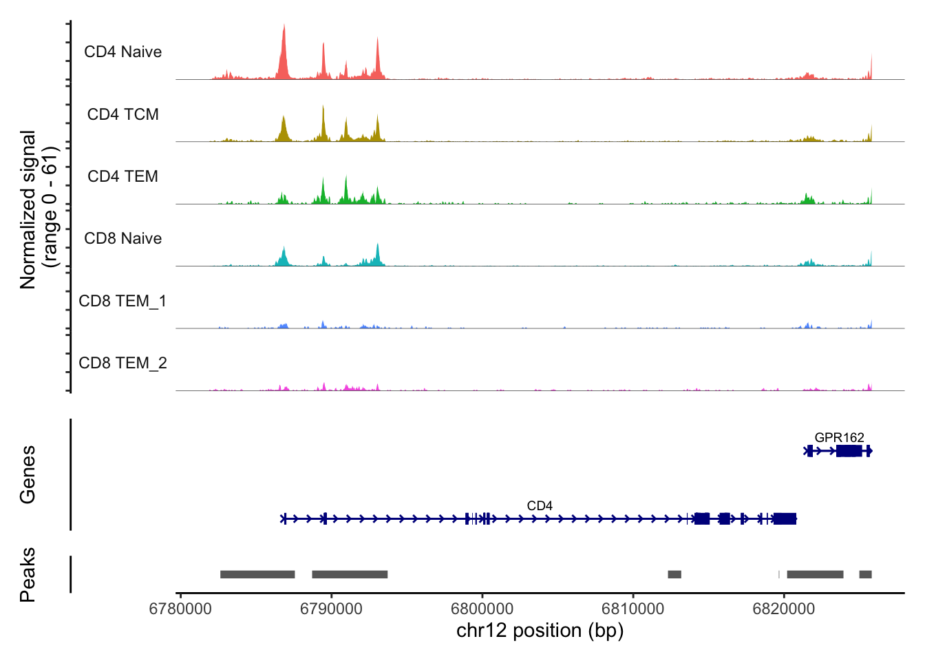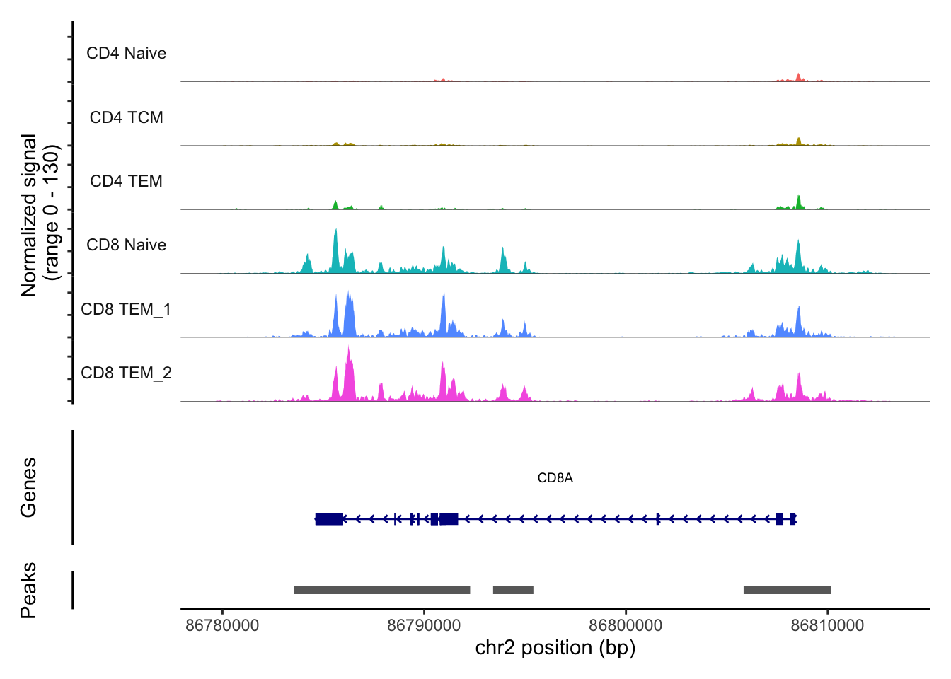We can also visualise the ATAC-seq regions around a gene of interest. We will use two marker genes of T cells (CD4 and CD8). We can see the ATAC-seq regions around the CD4 and CD8A genes differ for different cell types.