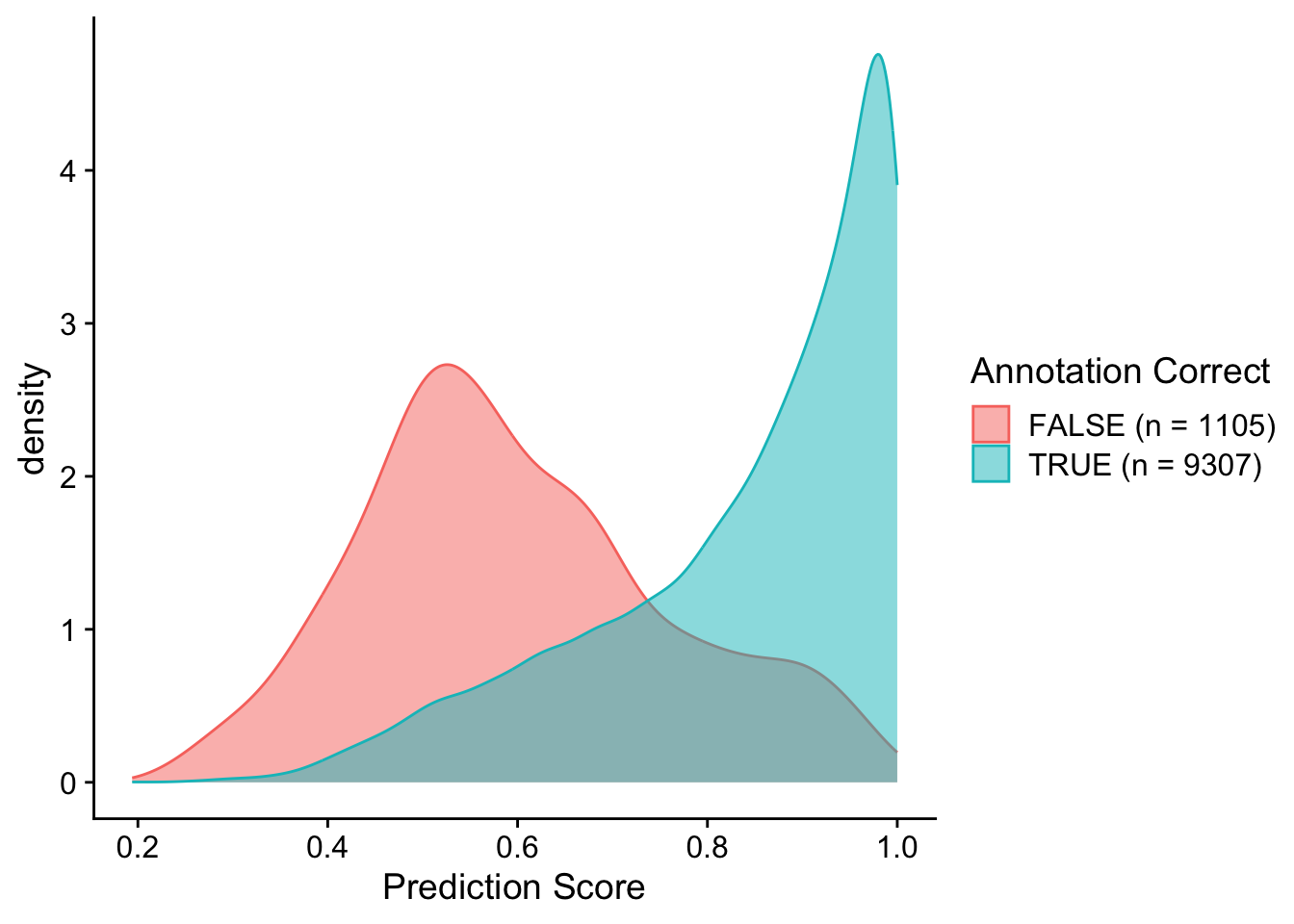 labels = c(paste0("FALSE (n = ", incorrect, ")"), paste0("TRUE (n = ", correct, ")"))) + xlab("Prediction Score")